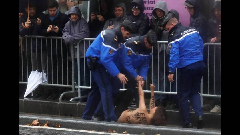 Η γυμνόστηθη ακτιβίστρια, που είχε γράψει τη λέξη «Υποκρισία» στο στήθος της, πήδηξε πάνω από τα φράγματα ασφαλείας που είχαν στηθεί στη λεωφόρο των Ηλυσίων Πεδίων και κατευθύνθηκε προς το αυτοκίνητο του Τραμπ.