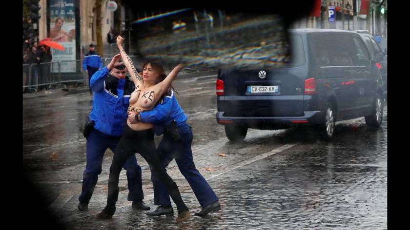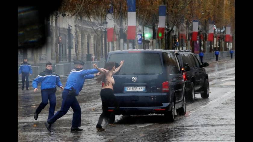 Αναστάτωση επικράτησε το πρωί στην τελετή για την επέτειο της λήξης του Α’ Παγκοσμίου Πολέμου στο Παρίσι, καθώς ακτιβίστρια της οργάνωσης Femen παραβίασε τα μέτρα ασφαλείας κατά τη διέλευση της επίσημης πομπής και έτρεξε προς το αυτοκίνητο του Αμερικανού προέδρου, Ντόναλντ Τραμπ.