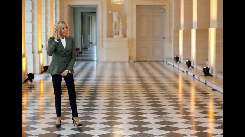 Φορώντας ένα χακί σύνολο, η Πρώτη Κυρία της Γαλλίας υποδέχθηκε μαζί με την Κατρίν Πεγκάρ, την πρόεδρο του κρατικού οργανισμού του Ανακτόρου των Βερσαλλιών, τους 40 προσκεκλημένους της, όπως μετέδωσαν δημοσιογράφοι του Γαλλικού Πρακτορείου.