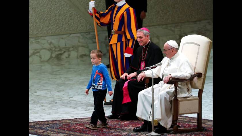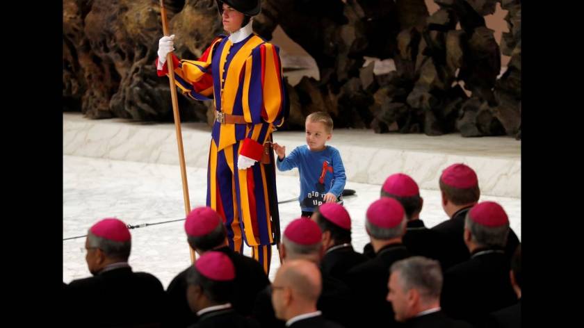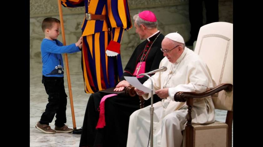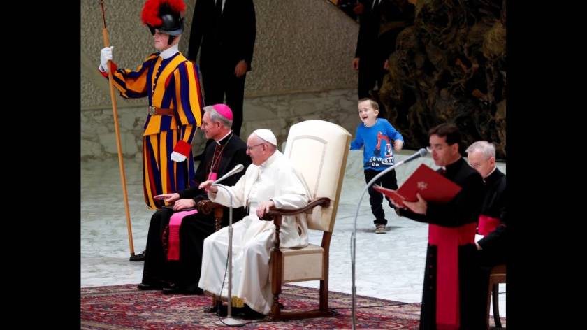 Ένα αγοράκι επισκίασε τον πάπα Φραγκίσκο σήμερα, αφού ξέφυγε από τα χέρια της μητέρας του και έτρεξε προς την εξέδρα όπου εκφωνούσε μια ομιλία ο ποντίφικας, τραβώντας το χέρι ενός Ελβετού φρουρού και παίζοντας πίσω από την παπική πολυθρόνα.