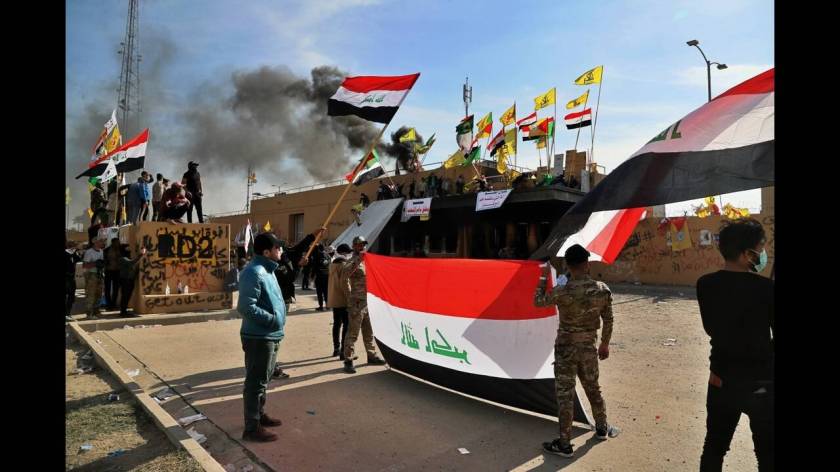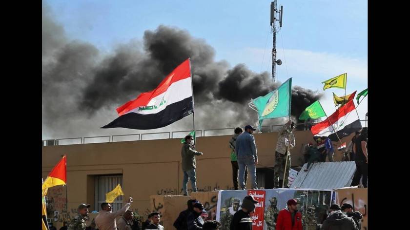 Χθες Τρίτη, η εξωτερική περίμετρος της πρεσβείας κατακλύστηκε από διαδηλωτές οργισμένους από τις αμερικανικές αεροπορικές επιδρομές κατά μιας υποστηριζόμενης από το Ιράν οργάνωσης, της Κατάεμπ Χεζμπολάχ, σε πέντε σημεία σε Ιράκ και Συρία, που είχαν ως αποτέλεσμα να σκοτωθούν τουλάχιστον 25 μέλη της.
