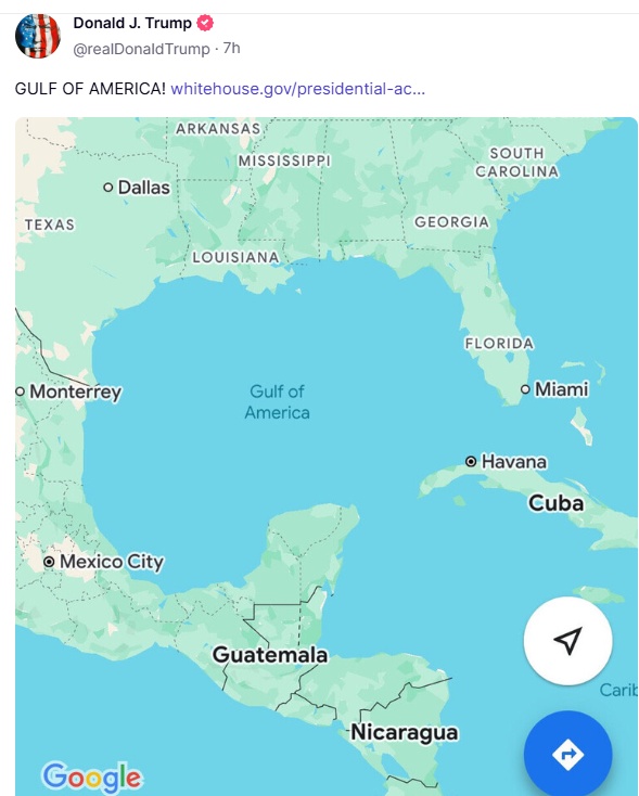 «ΚΟΛΠΟΣ ΤΗΣ ΑΜΕΡΙΚΗΣ», έγραψε ενθουσιασμένος ο Τραμπ στο Truth Social συνοδεύοντας την ανάρτησή του με ένα screenshot από τον χάρτη του Google Maps και ένα link που οδηγεί στην ανακοίνωση που έκανε την Κυριακή με την οποία όρισε την 9η Φεβρουαρίου «ημέρα του Κόλπου της Αμερικής». Και ο επίσημος λογαριασμός του Λευκού Οίκου στο Χ ανήρτησε το μήνυμα: «ΚΟΛΠΟΣ ΤΗΣ ΑΜΕΡΙΚΗΣ στο @GoogleMaps».
