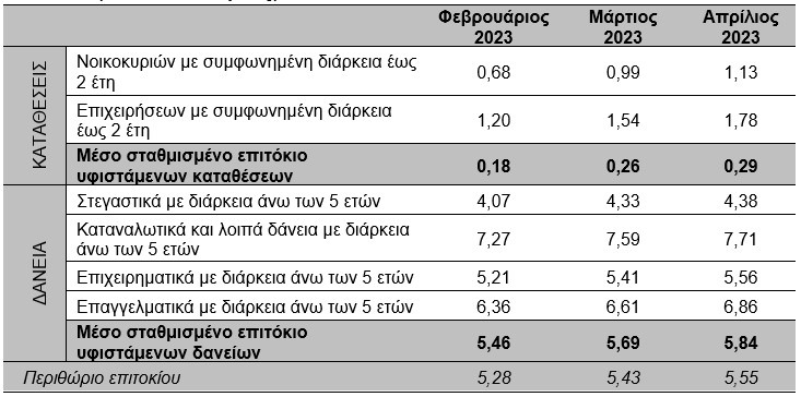 - Τον Απρίλιο του 2023, το μέσο σταθμισμένο επιτόκιο του συνόλου των υφιστάμενων καταθέσεων αυξήθηκε στο 0,29%, ενώ το αντίστοιχο επιτόκιο των υφιστάμενων δανείων αυξήθηκε στο 5,84%.