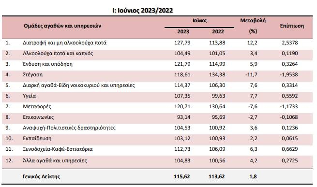Η αύξηση του Γενικού ΔΤΚ κατά 1,8% τον μήνα Ιούνιο 2023, σε σύγκριση με τον αντίστοιχο Δείκτη του Ιουνίου 2022, προήλθε κυρίως από τις μεταβολές στις ακόλουθες ομάδες αγαθών και υπηρεσιών: