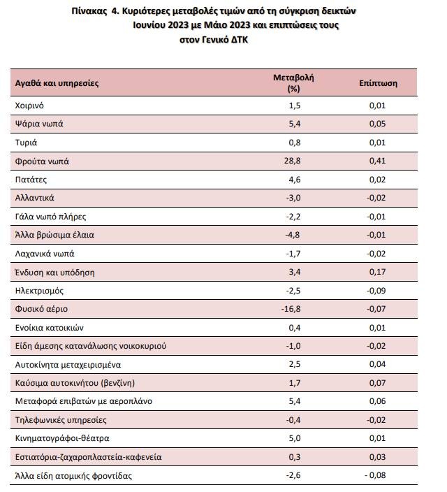 Η αύξηση του Γενικού ΔΤΚ κατά 0,6% τον μήνα Ιούνιο 2023, σε σύγκριση με τον αντίστοιχο Δείκτη του Μαΐου 2023, προήλθε κυρίως από τις μεταβολές στις ακόλουθες ομάδες αγαθών και υπηρεσιών: