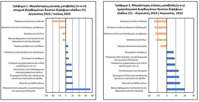 Κατά τη σύγκριση των δεικτών του Αυγούστου 2023 με τους αντίστοιχους δείκτες του Αυγούστου 2022, η μεγαλύτερη ποσοστιαία μείωση καταγράφηκε στον κλάδο κατασκευής ειδών ένδυσης, ενώ η μεγαλύτερη ποσοστιαία αύξηση καταγράφηκε στον κλάδο παραγωγής βασικών φαρμακευτικών προϊόντων και φαρμακευτικών σκευασμάτων.