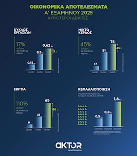 Η θετική οικονομική πορεία του Ομίλου AKTOR συνεχίστηκε δυναμικά στο πρώτο μισό του έτους, σύμφωνα με τις οικονομικές καταστάσεις για το Α’ Εξάμηνο του 2025, που δημοσιεύθηκαν σήμερα και επιβεβαιώνουν τον ορθό επιχειρηματικό σχεδιασμό και τους στόχους της Διοίκησης για ισχυρή ανάπτυξη, μέσα από έργα υψηλής κερδοφορίας, ένα νέο λειτουργικό μοντέλο, την επέκταση δραστηριοτήτων σε νέους τομείς της οικονομίας και την παραγωγή αξίας για τους μετόχους.