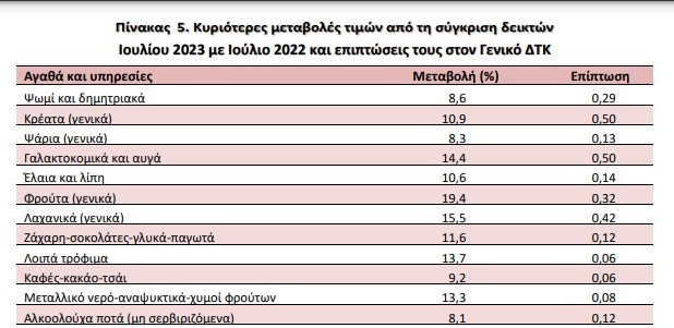 Πλέον οι μεγαλύτερες αυξήσεις σε σύγκριση με τον Ιούλιο του 2023 καταγράφονται στα φρούτα και τα λαχανικά, με αύξηση 19,4% και 15,5% αντίστοιχα.