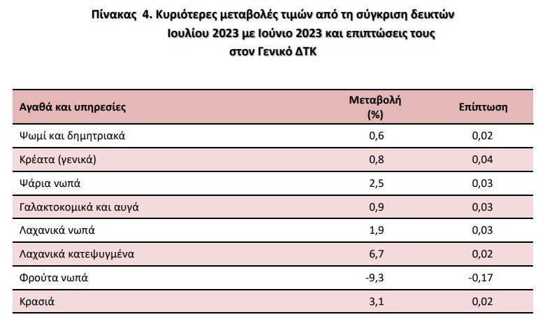 Αντίθετα στα νωπά φρούτα καταγράφεται μείωση 9,3% σε διάστημα ενός μηνός, στην κατηγορία «άλλα βρώσιμα έλαια» πτώση 3,58% και σε χυμούς φρούτων, 2,53%.