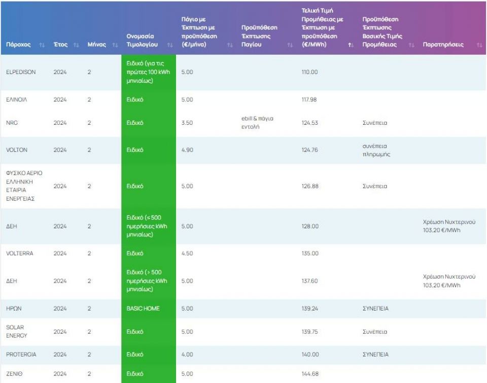 Ο διαδραστικός πίνακας επιτρέπει στους ενδιαφερόμενους να συγκρίνουν εύκολα και γρήγορα τις τιμές ανά κιλοβατώρα μεταξύ των παρόχων, το μηνιαίο πάγιο, αν παρέχεται έκπτωση και υπό ποιες προϋποθέσεις, αν διατίθεται νυχτερινό τιμολόγιο και πώς διαμορφώνεται η τελική τιμή προμήθειας.
