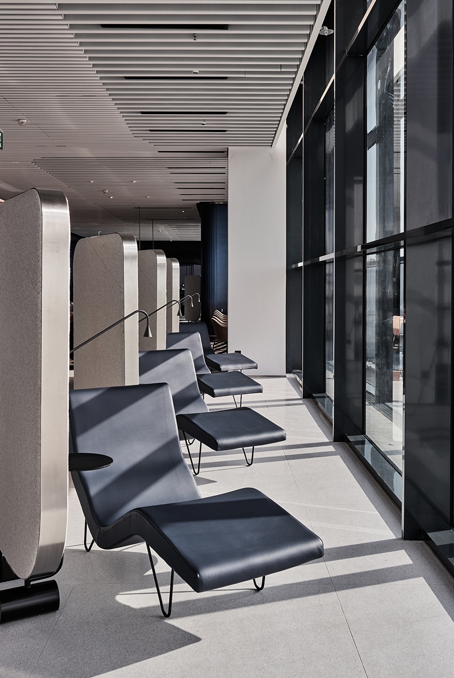 Το φυσικό φως και η εντυπωσιακή θέα στους διαδρόμους προσγείωσης και απογείωσης του αεροδρομίου σε συνδυασμό με τα υλικά υψηλής ποιότητας όπως το μάρμαρο, το μωσαϊκό, το γυαλί και το ξύλο δημιουργούν ένα σύγχρονο και μοντέρνο χώρο.