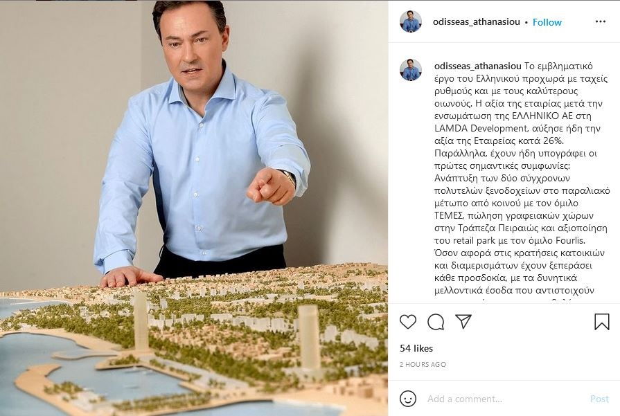 Μάλιστα, με δεδομένο ότι μέσα από το προφίλ του στο Instragram (@odisseas_athanasiou) ο κ. Αθανασίου αναρτά υλικό και πληροφορίες για τα έργα που βρίσκονται σε εξέλιξη στο Ελληνικό, όσοι ενδιαφέρονται να πληροφορούνται άμεσα και «από πρώτο χέρι» το τι συμβαίνει στο έργο μπορούν να τον ακολουθήσουν στο δημοφιλές κοινωνικό δίκτυο.