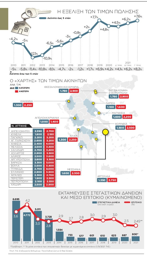 Η ανοδική πορεία της κτηματαγοράς τόσο στις ζητούμενες τιμές πώλησης όσο και στις τιμές ενοικίασης ήταν χρονικά ταυτόχρονη. Οσον αφορά τις ζητούμενες τιμές πώλησης, το 2018 αποτέλεσε την πρώτη χρονιά που οι τιμές κατέγραψαν αύξηση κατά +1,5%, μια αύξηση που συνεχίστηκε το 2019 κατά 7,2%, το 2020 κατά 4,3%, καθώς και το 2021. Σύμφωνα με τα πρόσφατα στοιχεία της ΤτΕ, το δεύτερο τρίμηνο οι τιμές των κατοικιών ενισχύθηκαν με ετήσιο ρυθμό της τάξεως του 4,4%, ενώ το γ’ τρίμηνο κατά 7,6% σε σχέση με το αντίστοιχο τρίμηνο του 2020. Σύμφωνα με τα άνωθεν, κατά την περίοδο 2018-2020, στην Αθήνα, οι τιμές πώλησης των κατοικιών έχουν καταγράψει συνολική αύξηση της τάξεως του 20%, ενώ με βάση τα μέχρι τώρα δεδομένα, το 2021, θα ξεπεράσει το 25%.