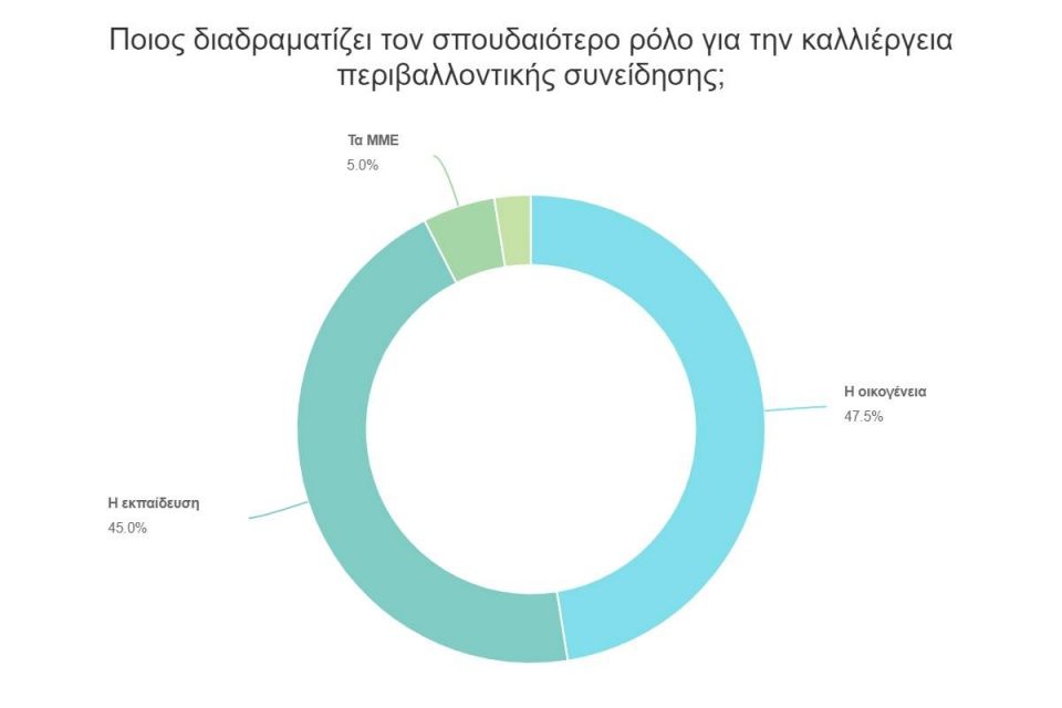 Η περιβαλλοντική συνείδηση κάθε πολίτη είναι, όπως φαίνεται, ένα από τα πιο σημαντικά σημεία, προκειμένου η ανθρωπότητα συνολικά να αλλάξει πορεία, να υιοθετήσει φιλικότερες στο περιβάλλον πρακτικές και να προστατεύσει τον πλανήτη και τη ζωή σε αυτόν. Το Act for Earth, η περιβαλλοντική πλατφόρμα του CNN Greece, έθεσε το ερώτημα «Ποιος διαδραματίζει τον σπουδαιότερο ρόλο για την καλλιέργεια περιβαλλοντικής συνείδησης;», δίνοντας στους πολίτες τη δυνατότητα επιλογής μεταξύ τεσσάρων πιθανών απαντήσεων, οι οποίες συγκέντρωσαν τα εξής ποσοστά: