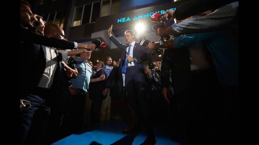 Πανηγυρικό ήταν το κλίμα στο προεκλογικό κέντρο της Νέας Δημοκρατίας στην πλατεία Κλαυθμώνος, όπου οι φίλοι της «γαλάζιας» παράταξης υποδέχτηκαν, επευφημώντας τον Κυριάκο Μητσοτάκη.