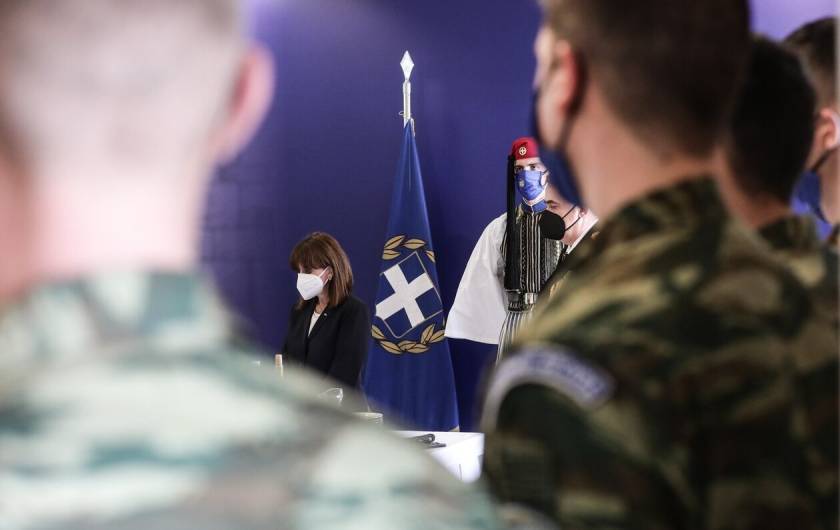«Με χαρά βρίσκομαι σήμερα ανάμεσά σας, για την κοπή της πρωτοχρονιάτικης πίτας. Η τιμή και η ευθύνη που επωμίζεστε υπηρετώντας στην Προεδρική Φρουρά είναι μεγάλη και ο τρόπος που εκπληρώνετε τα καθήκοντά σας υποδειγματικός, προκαλώντας την εκτίμηση και τον θαυμασμό όλων μας», ανέφερε απευθυνόμενη στους Εύζωνες και τα στελέχη της Φρουράς και συνέχισε:
