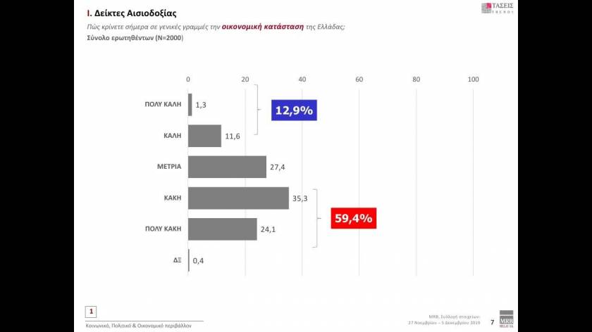 Στο ερώτημα, «πώς κρίνετε σε γενικές γραμμές σήμερα την οικονομική κατάσταση της Ελλάδας», το 59,4% απαντά «Πολύ κακή – κακή» και το 12,9% απαντά «Πολύ καλή-καλή».