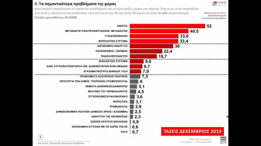 Τα πέντε σημαντικότερα προβλήματα της χώρας είναι η ανεργία με 52%, το μεταναστευτικό/ προσφυγικό/ οικονομικοί μετανάστες με 40,5%, η υγεία/περίθαλψη με 33,6%, το φορολογικό σύστημα με 33,4% και η οικονομική ανάπτυξη με 30%.
