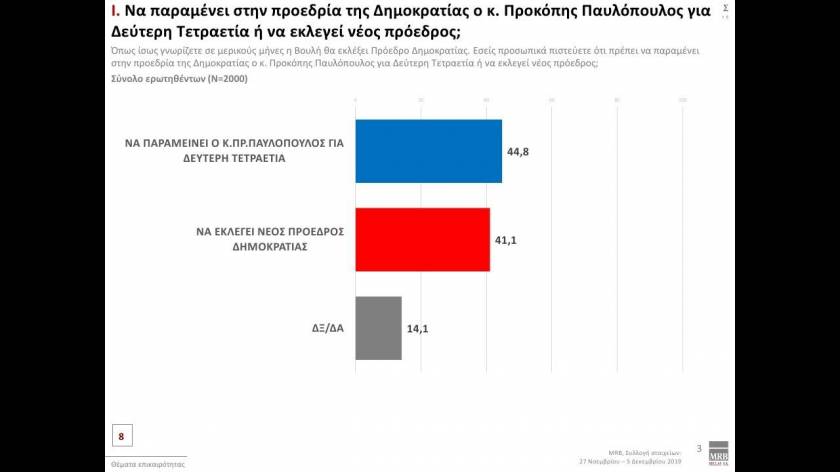 Ως προς την επικείμενη εκλογή Προέδρου Δημοκρατίας σημαντικό ποσοστό των πολιτών (44,8%) δηλώνουν ότι θα επιθυμούσαν να παραμείνει ο Προκόπης Παυλόπουλος για δεύτερη θητεία ενώ το 41,1% επιθυμεί νέο πρόσωπο στην θέση του Προέδρου της Δημοκρατίας.