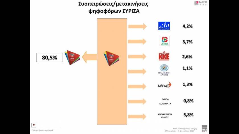 Ο ΣΥΡΙΖΑ συγκεντρώνει 24,5%, τρίτο κόμμα αναδεικνύεται το Κίνημα Αλλαγής με 7,7% και ακολουθεί το ΚΚΕ με 5,5%, η Ελληνική Λύση με 4,3% και το ΜέΡΑ25 με 3,2%. Εκτός βουλής παραμένει η Χρυσή Αυγή με ποσοστό 2,7%, ενώ η ΑΝΤΑΡΣΥΑ συγκεντρώνει 1,1%.