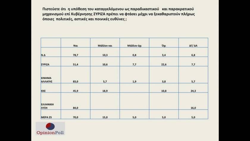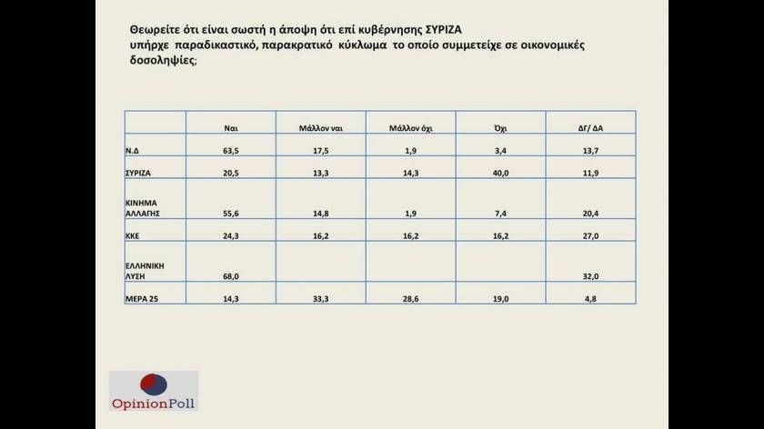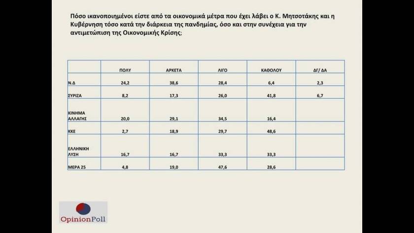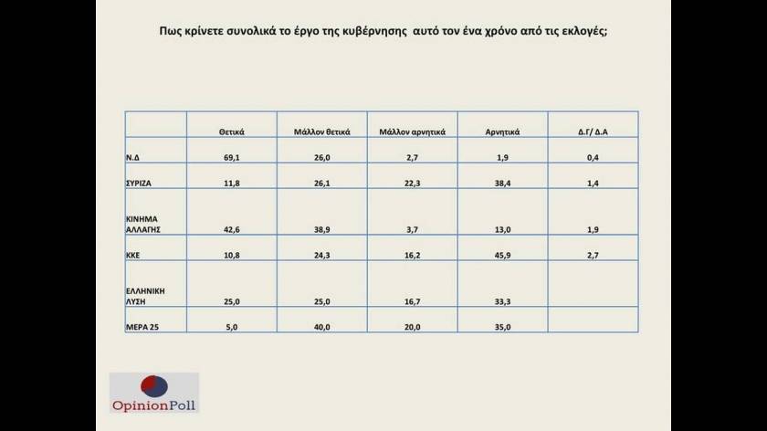 Με διπλάσιο ποσοστό προηγείται η Νέα Δημοκρατία του ΣΥΡΙΖΑ σε νέα δημοσκόπηση της OPINION POLL, ένα χρόνο αφότου ο Κυριάκος Μητσοτάκης ανέλαβε τη διακυβέρνηση της χώρας.
