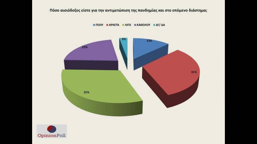 Τέλος, όσον αφορά στην αντιμετώπιση της πανδημίας και στο επόμενο διάστημα, η μεγάλη πλειοψηφία των ερωτηθέντων (75%) εμφανίζεται αισιόδοξη (πολύ, αρκετά λίγο), ενώ απαισιοδοξία εκφράζει το 22%.