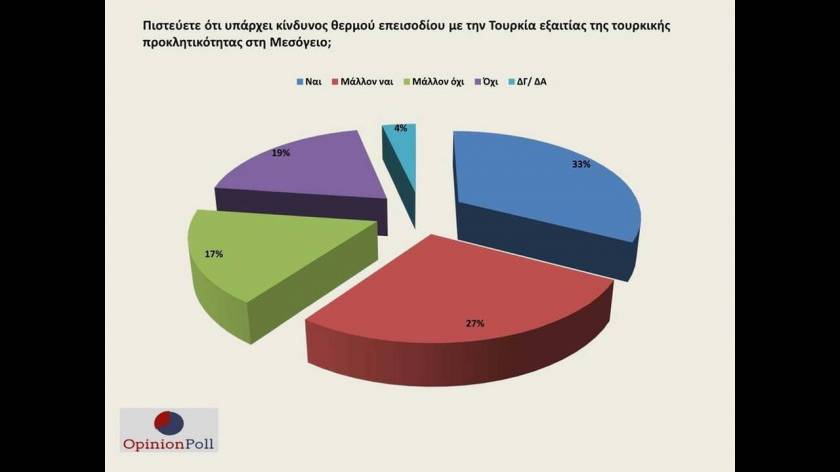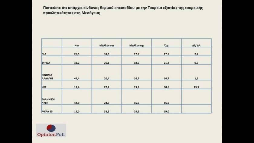 Ακολουθούν το ΚΙΝΑΛ με 5,8%, το ΚΚΕ με 5%, η Ελληνική Λύση με 3,5% και το «Μέρα 25» με 2,5%.