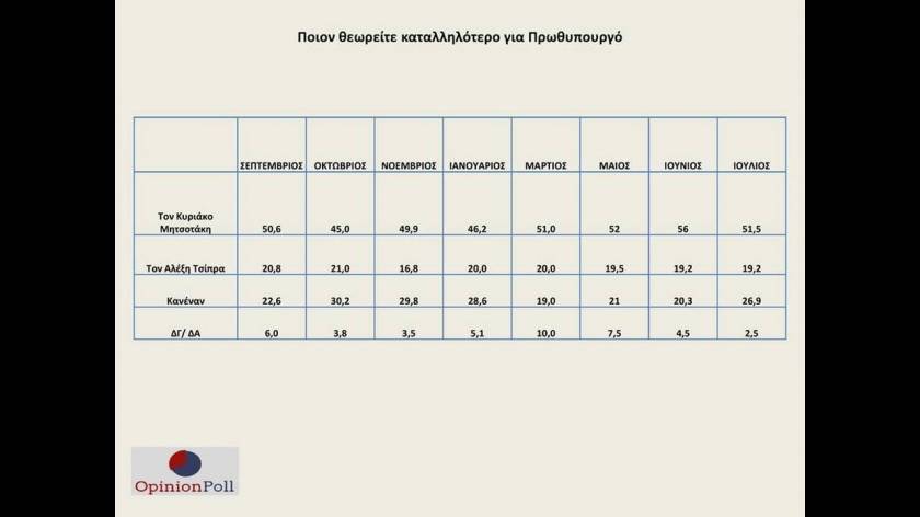 Ο Κυριάκος Μητσοτάκης προηγείται με μεγάλη διαφορά (32,3%) του Αλέξη Τσίπρα στην καταλληλότητα για πρωθυπουργός, με ποσοστό προτίμησης 51,5% έναντι 19,2%.