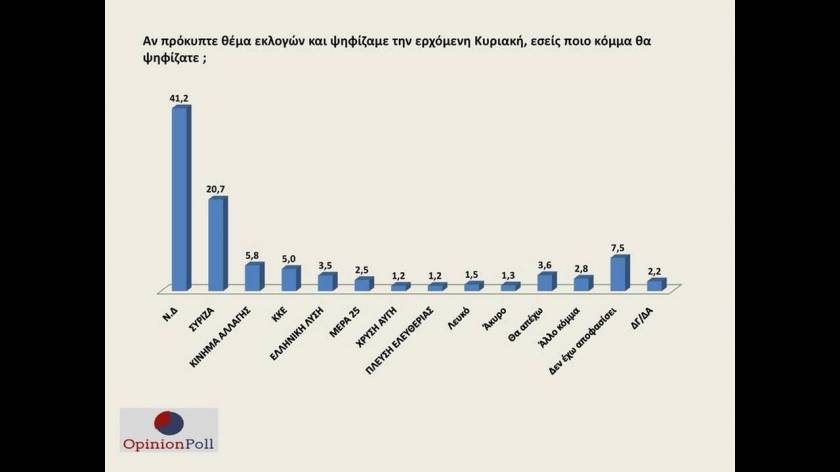 Σύμφωνα με αυτή, η «γαλάζια» παράταξη συγκεντρώνει το 41,2% των προτιμήσεων των πολιτών, εάν οι εκλογές γίνονταν την ερχόμενη Κυριακή έναντι του 20,7% που επιλέγει τον ΣΥΡΙΖΑ.