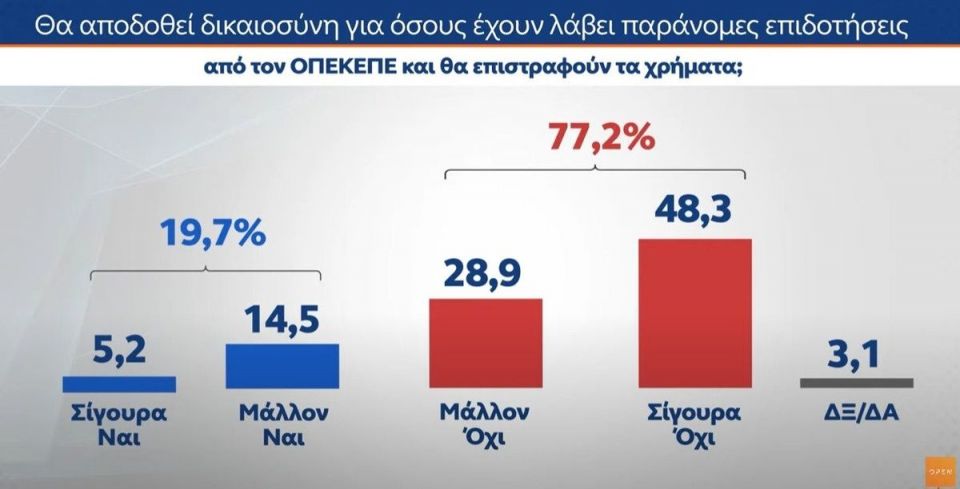 Στο ερώτημα «θα αποδοθεί δικαιοσύνη για όσους έχουν λάβει παράνομες επιδοτήσεις από τον ΟΠΕΚΕΠΕ και θα επιστραφούν τα χρήματα» οι πολίτες απαντούν: