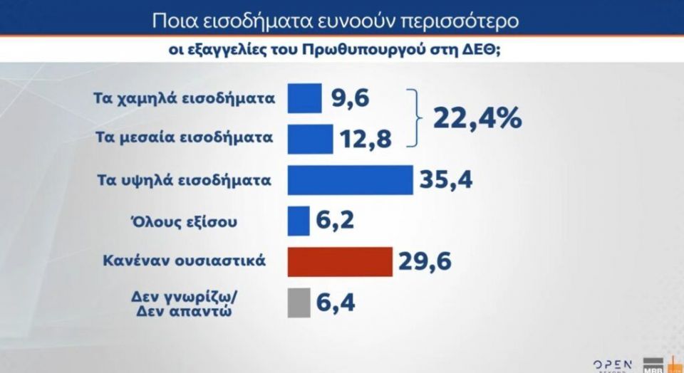 Στο ερώτημα «ποια εισοδήματα ευνοούν περισσότερο οι εξαγγελίες του πρωθυπουργού στη ΔΕΘ» οι απαντήσεις που καταγράφονται είναι: