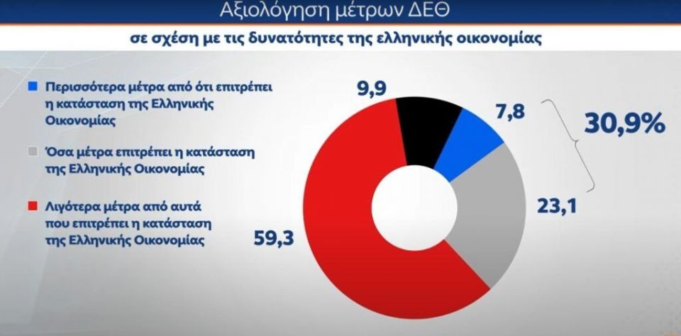 Ως προς την αξιολόγηση των μέτρων της ΔΕΘ σε σχέση με τις δυνατότητες της ελληνικής οικονομίας το 7,8% απαντά «περισσότερα μέτρα από ότι επιτρέπει η κατάσταση της ελληνικής οικονομίας», το 23,1% «όσα μέτρα επιτρέπει η κατάσταση της ελληνικής οικονομίας» και το 59,3% «λιγότερα μέτρα από αυτά που επιτρέπει η κατάσταση της ελληνικής οικονομίας».