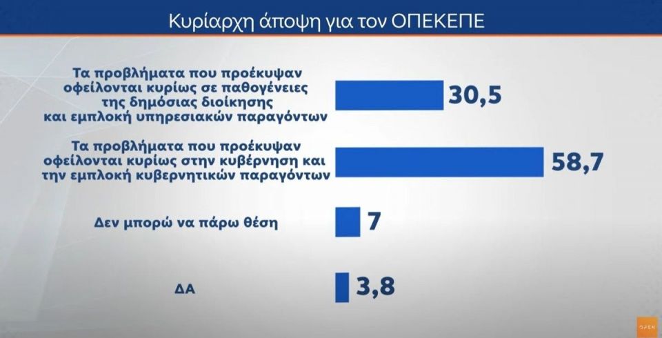 Αναφορικά με την κυρίαρχη άποψη για τον ΟΠΕΚΕΠΕ το 30,5% αναφέρει πως «τα προβλήματα που προέκυψαν οφείλονται κυρίως σε παθογένειες της δημόσιας διοίκησης και εμπλοκή υπηρεσιακών παραγόντων», το 58,7% «τα προβλήματα που προέκυψαν οφείλονται κυρίως στην κυβέρνηση και την εμπλοκή κυβερνητικών παραγόντων», το 7% «δεν μπορώ να πάρω θέση» και το 3,8% δεν απαντά.
