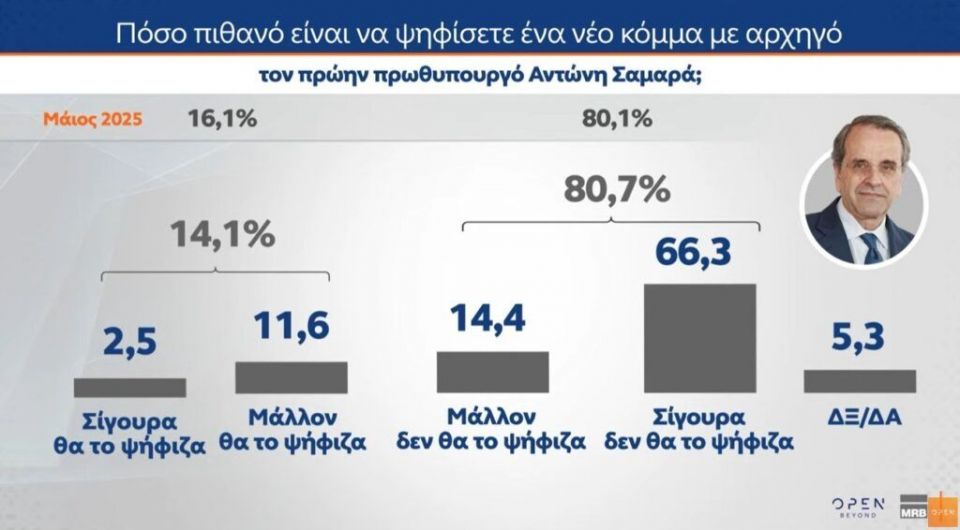 Όσον αφορά το «κόμμα Σαμαρά» και το ερώτημα «πόσο πιθανό είναι να ψηφίσετε ένα νέο κόμμα με αρχηγό τον πρώην πρωθυπουργό Αντώνη Σαμαρά» οι ερωτηθέντες απαντούν: