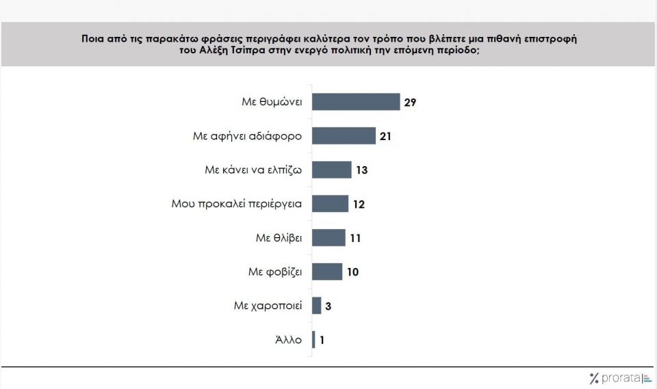 ΓΙΩΡΓΟΣ ΚΟΝΤΑΡΙΝΗΣ/EUROKINISSIΟι πρώτες αντιδράσεις των πολιτών για την επιστροφή του Αλέξη Τσίπρα στο πολιτικό προσκήνιο καταγράφονται σε δημοσκόπηση της Prorata που διενεργήθηκε για λογαριασμό της «Ναυτεμπορικής» και που δείχνει τις διαθέσεις της κοινής γνώμης απέναντι στον πρώην πρωθυπουργό και το ενδεχόμενο ίδρυσης νέου πολιτικού φορέα.