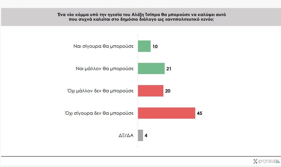 Στο ερώτημα αν ένα νέο κόμμα υπό τον Αλέξη Τσίπρα θα μπορούσε να καλύψει το λεγόμενο «αντιπολιτευτικό κενό», οι απαντήσεις δείχνουν σοβαρές επιφυλάξεις. Σίγουρα και μάλλον απαντά συνολικά ένα 31%, ενώ το 65% δηλώνει σίγουρα και μάλλον όχι.