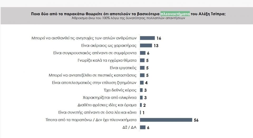 Στα δύο σημαντικότερα πλεονεκτήματα που αποδίδονται στον πρώην πρωθυπουργό, κυριαρχεί η άποψη ότι «μπορεί να αισθανθεί τις ανησυχίες των απλών ανθρώπων» και είναι ακέραιος χαρακτήρας. Ένα 56% απαντά ότι δεν έχει πλεονεκτήματα.