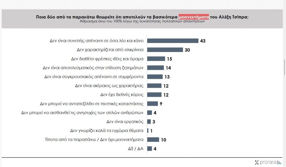 Στα δύο κυριότερα μειονεκτήματα που επιλέγουν οι πολίτες για τον Αλέξη Τσίπρα, είναι η ασυνέπεια σε αυτά που λέει και κάνει και η απουσία ειλικρίνειας.