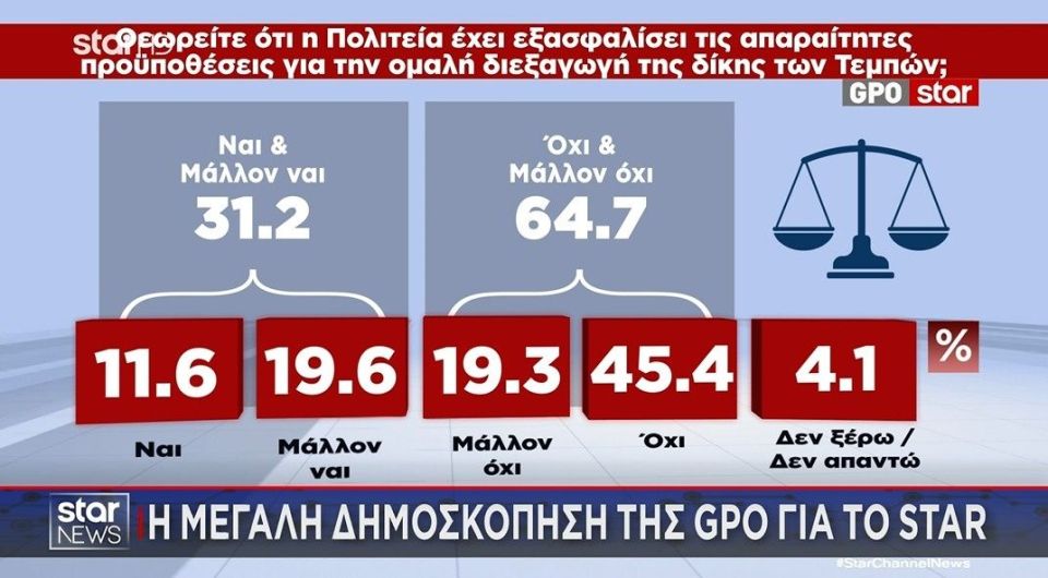 Για τη δίκη των Τεμπών και την ερώτηση «Θεωρείτε ότι η Πολιτεία έχει εξασφαλίσει τις απαραίτητες προϋποθέσεις για την ομαλή διεξαγωγή της δίκης των Τεμπών» οι ερωτηθέντες απαντούν:
