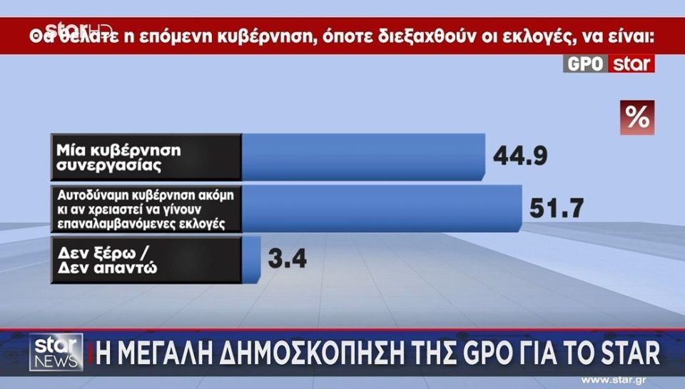 Αυτοδύναμη κυβέρνηση ακόμα και αν χρειαστούν επαναλαμβανόμενες εκλογές ζητούν λίγο... παραπάνω από ένας στους δύο πολίτες. Στο σχετικό ερώτημα το 51,7% υποστηρίζει ότι θέλει αυτοδύναμη κυβέρνηση ακόμα και αν χρειαστεί να γίνουν επαναλαμβανόμενες εκλογές, έναντι του 44,9% που προτιμά μία κυβέρνηση συνεργασίας.