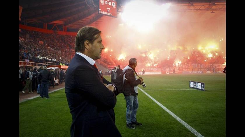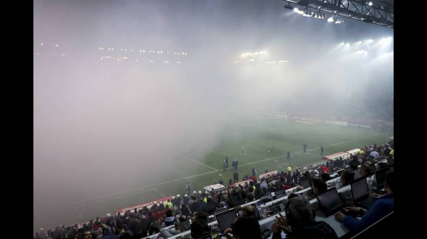 Οπαδοί του Ολυμπιακού έβαλαν «φωτιά» στις εξέδρες με αμέτρητα βεγγάλικα και καπνογόνα που προκαλέσαν και δεκάλεπτη καθυστέρηση στην έναρξη του αγώνα.