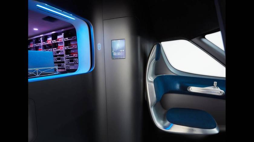 Ενδιαφέρον παρουσιάζει και η καμπίνα του οδηγού, η οποία είναι εξίσου ή μάλλον ακόμα πιο φουτουριστική σε σχέση με την εξωτερική εμφάνιση. Έτσι δεν υπάρχουν ούτε τιμόνι, ούτε πεντάλ, ούτε κεντρική κονσόλα, ενώ τα πάντα ελέγχονται μέσω ενός joy stick. Φυσικά υπάρχουν πολλές οθόνες και πλήρης διασύνδεση με το διαδίκτυο.