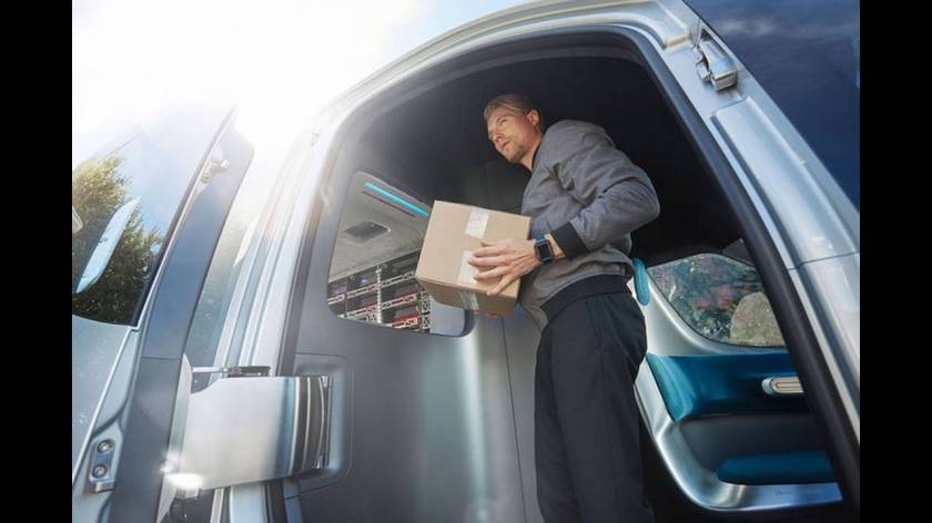 Το ηλεκτρικό Mercedes Vision Van Concept φορτώνεται με ένα σύστημα ραφιών, στο οποίο τα πακέτα έχουν προ-τοποθετηθεί με τέτοιο τρόπο ώστε η διανομή τους να γίνεται με βάση τη βέλτιστη διαδρομή που υπολογίζει το σύστημα πλοήγησης. Πηγή: Mercedes
