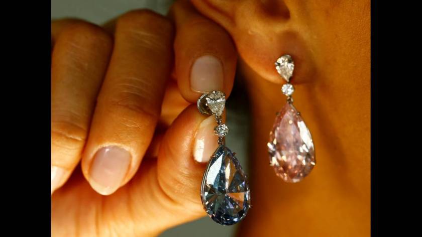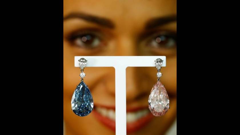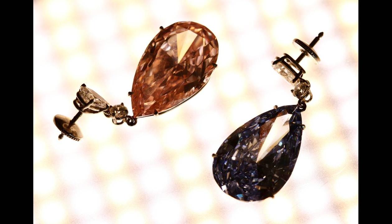 "Tα σπουδαιότερα σκουλαρίκια που έχουν τεθεί ποτέ σε δημοπρασία". Έτσι παρουσίασαν το ζευγάρι από τα πολύτιμα διαμαντένια σκουλαρίκια σε ροζ και μπλε οι άνθρωποι του οίκου δημοπρασιών Sotheby's.
