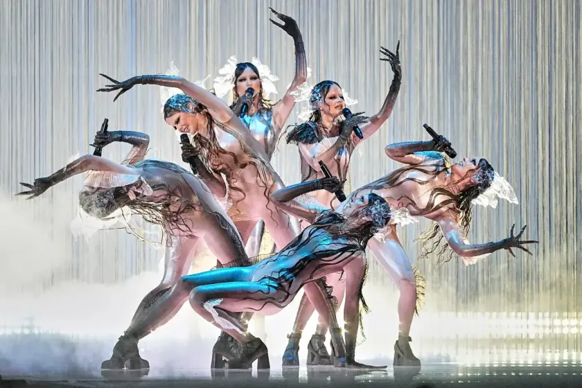 Ο Tautumeitas από τη Λετονία ερμηνεύει το τραγούδι «Bur Man Laimi» κατά τη διάρκεια πρόβας τζενεράλε για τον δεύτερο ημιτελικό του 69ου Διαγωνισμού Τραγουδιού της Eurovision, στη Βασιλεία της Ελβετίας, στις 14 Μαΐου 2025.