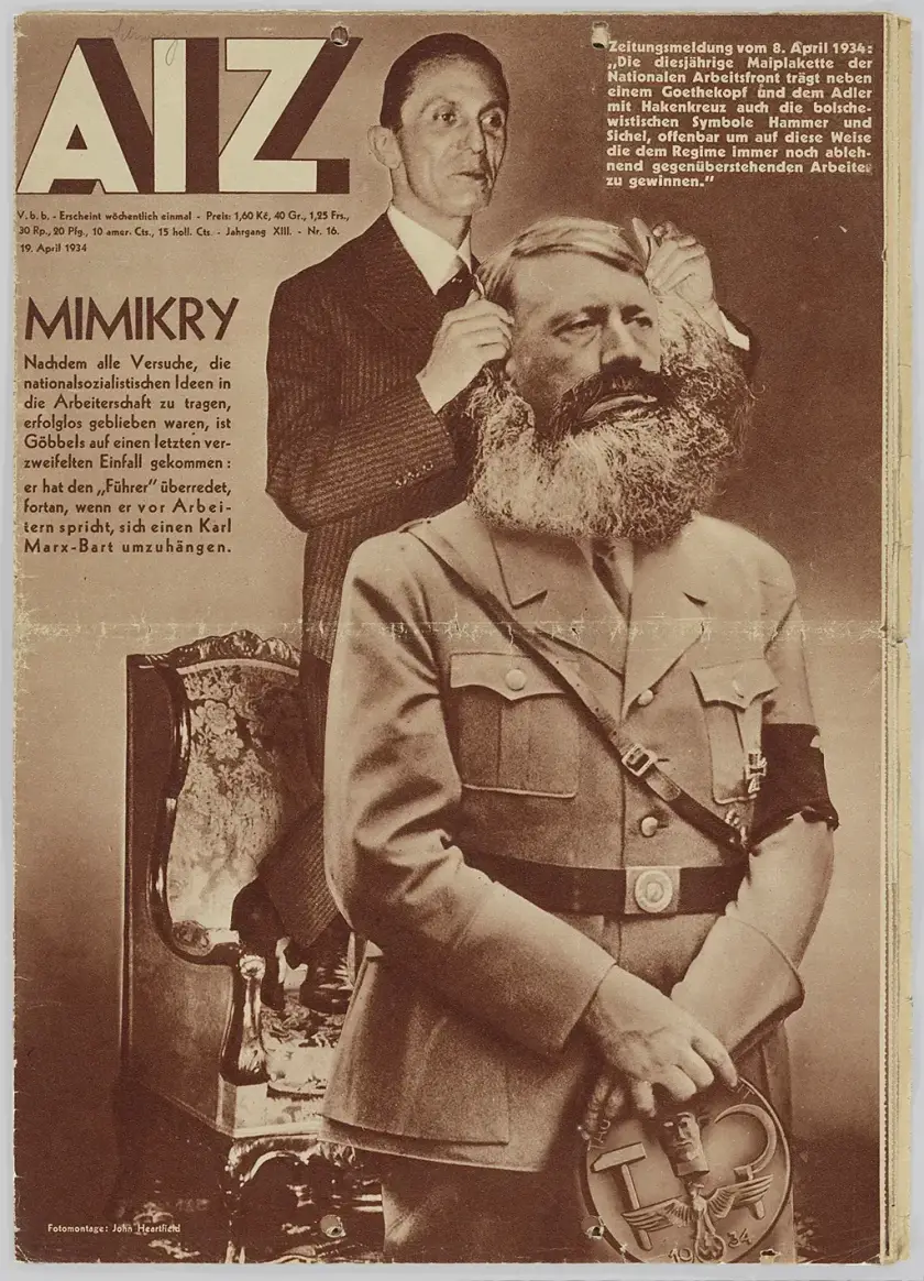 Χαρακτηριστικό παράδειγμα αποτελεί το φωτομοντάζ «Mimicry» (1934) του John Heartfield. Στην εικόνα, ο υπουργός Προπαγάνδας των Ναζί, Γιόζεφ Γκέμπελς, παρουσιάζεται να μεταμφιέζει τον Αδόλφο Χίτλερ σε Καρλ Μαρξ. Με το έργο αυτό, ο καλλιτέχνης προειδοποιούσε την εργατική τάξη να μην παρασυρθεί από τις υποσχέσεις του ναζιστικού καθεστώτος.