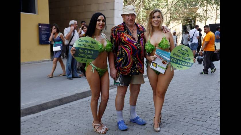 Είμαστε εδώ για να στείλουμε ένα μήνυμα σε όλους να συμπονούν τα ζώα, να μην καταναλώνουν κρέας και να επιλέξουν μια χορτοφαγική διατροφή" δήλωσε η Κιάρα Μπένακ, ένα από τα μοντέλα που συμμετείχε στην εκστρατεία της PETA.